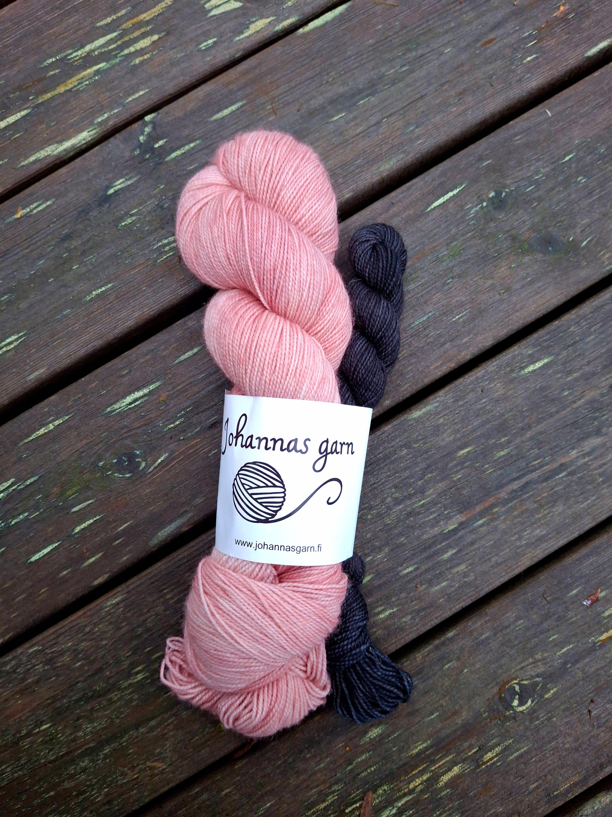 100g rosa och 20g svart. 425m och 85m. Merino sock 75% superwash merinoull och 25% nylon.